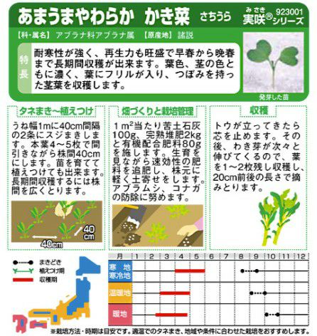 他の画像を見る 葉菜 種 【 あまうまやわらかかき菜 さちうら 】 実咲小袋 ( 葉菜の種 ) 当店特別価格 ¥ 385 税込 柔らかい茎葉にコクと甘みがたっぷり! カートに入れる お気に入りに登録する