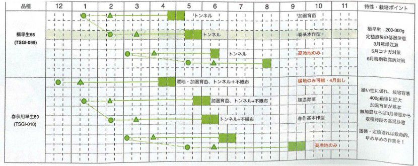 秋作にもお使いいただけます。生育後半の耐寒性は中生・晩生品種と比べると弱いので、霜が降る前に収穫できるようにしましょう。