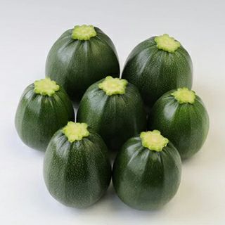 丸形のズッキーニ、濃緑色で光沢がある果実色。