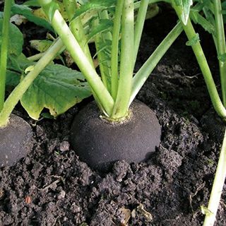 外皮は黒、果肉は白のコントラストが美しい、欧州で愛され続ける在来品種。春・秋両まき、直径8~10cmで丸型。