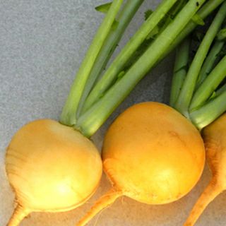 根部外皮は鮮やかな黄色、内部はクリーム色になる甲高のF1黄カブ。