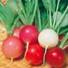 赤・白・紫・ピンク・薄桃紫色のハツカダイコンで、サラダに彩りを添えてくれます。葉は小カブに似た切れ込みのない丸葉、毛が少なくやわらかで根とともに一夜漬けにも利用できます。