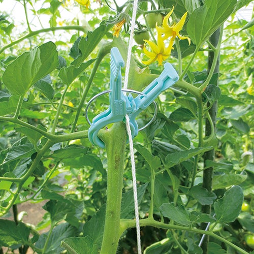クリップ支点部に2つのフックを組み込むことで耐久性がアップ。太めの誘引紐(麻紐・15号~20号クラス)に対応し、重量のある果菜類(トマトなど)の誘引に適します。支点部がダブルフックなので耐久性があり、紐を挟んでも支点部が浮き上がらず紐を強く挟み込みます。紐挿入口が大きく開くため、クリップの留め外しが簡単に行えます。耐候性ポリプロピレン使用で屋外でも長持ち。