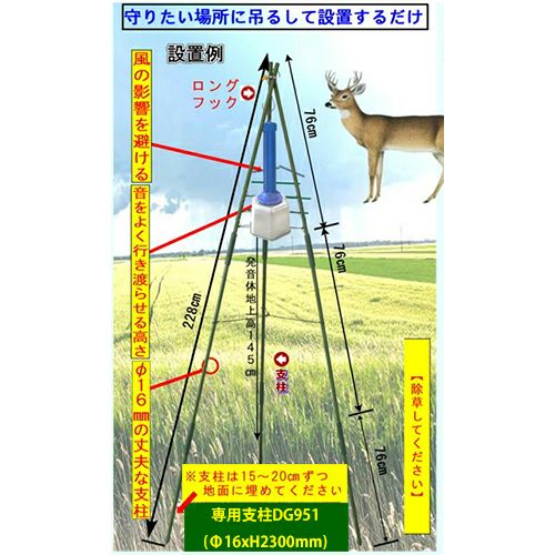 DG505、DG602TM専用支柱です。効果と効率を高めるために開発した専用支柱。木や建物などにぶら下げると死角が発生したり音を遮ぎったり、隠れる場所が生じたりします。そういった効果が半減する事案を解消します。特に自立しているため、設置場所を選ばす容易に設置が出来有効範囲を最大限に活用できます。