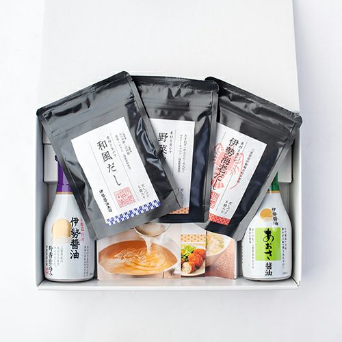 内容 伊勢醤油 伊勢の旅ギフト 伊勢醤油吟香仕込み 200ml×1本、あおさ醤油 200ml×1本、伊勢の和風だし5P入×1袋、伊勢の野菜だし5P入×1袋、伊勢海老だし5P入×1袋