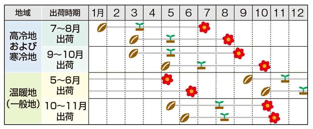 暖地 (春まき)3月上旬~下旬、(秋まき)10月上旬~下旬