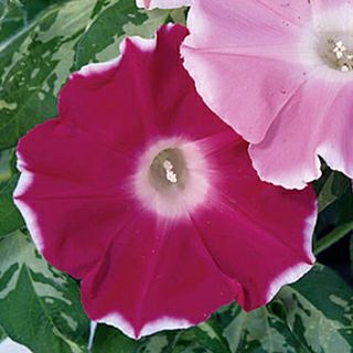 斑入りの葉。 花は赤、桃、茶、青紫にそれぞれ白い縁取りのある約10cmの花が多くつく。早咲きタイプ。つるは伸びにくい矮性種で支柱は不要。草丈低く鉢物向き。
