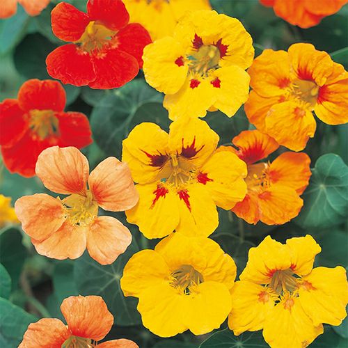 濃緑の葉で赤・だいだい・濃桃・黄色などの花色混合です。ハスに似た小さな葉は花とともに楽しめます。日当たりと風通しのよい場所を好みます。