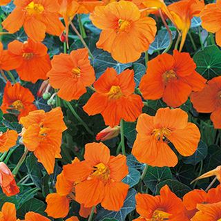 濃オレンジ花。つるの出にくい矮性種はハンギングや鉢栽培におすすめ。つる性は支柱やネットを利用して栽培。ノウゼンハレン科