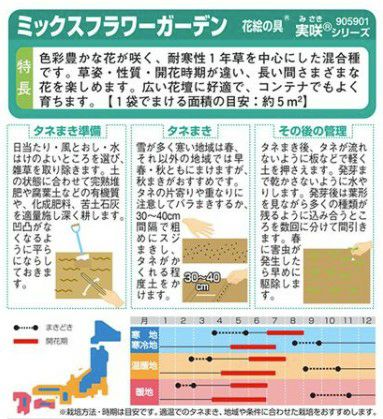 1袋でミックス花壇が手軽に作れます!花壇やコンテナに直接まいて育苗の手間がかからない、直まきでも楽しみたい草花。花色ごとに多彩な品種をミックスした絵袋です。1袋でそれぞれの同系色コーディネートができます。何が咲くかは育てた方のお楽しみ! ガーデンを輝かせる色合い!