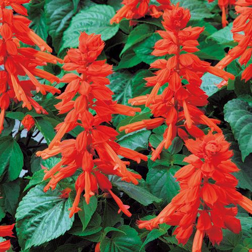 枝分かれが非常に多く、次々と花穂を伸ばして開花。印象的な赤花で、花壇はもちろん鉢やプランターを華やかに彩る。夏秋花壇には欠かせないサルビア。真っ赤な花の印象が強いが、それ以外の花色も多く、花穂の形も様々。シソ科