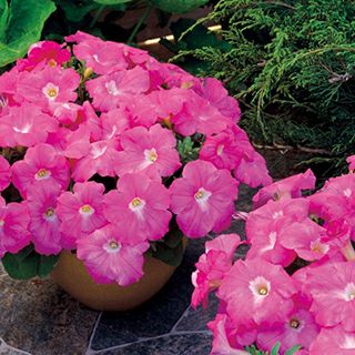 ペチュニアの新しい特性を追求し育成された品種。枝が横に伸びすぎず、ドーム型にまとまる草姿バランスの良い品種。開花が早くて分枝数も多いので株を覆うように花を付ける。強健で猛暑となる夏にも咲き続け、大株になっても株が乱れにくく一株でもボリュームのある大鉢を作ることができる。雨後の回復も早い。花径約7cm。