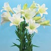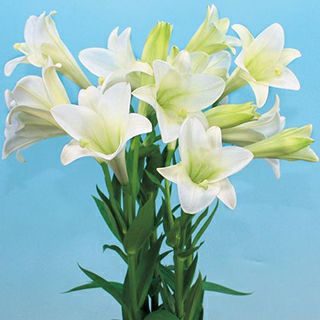 8月下旬~9月中旬開花で、彼岸まで採花可能。タネから楽しめる新鉄砲ユリ。花数が多く斜め上から横向きで、1 本でも花束のようなボリューム。スマートな草姿のため軽く作業性がよい。苗揃いがよく、葉枯れ病に強い。ユリ科