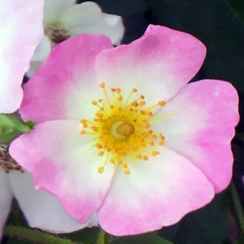 一重の淡いピンクの花は、花弁の縁が濃く中心部が白くなる。小輪だが大きな房咲きになる。丈夫で育てやすい。秋には実が楽しめる。