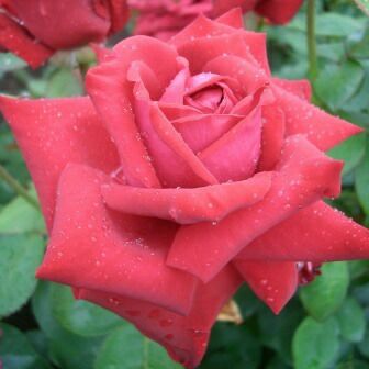 ビロードがかった濃い赤。ゆっくり開花し堂々たる花形になる。開花期はやや遅い。花付き・花保ちもよい。
