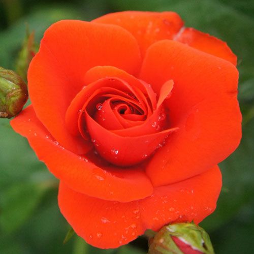 鮮やかな朱色で、輝きがある。樹勢がとても強く中輪としては良く伸びる。育てやすい。