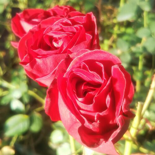 鮮やかなビロード赤で、房咲き性が強い。深い緑の葉と花との調和が素晴らしい。