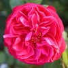 緋赤のロゼット咲きの大輪。光沢葉が、花を一層引き立てる。